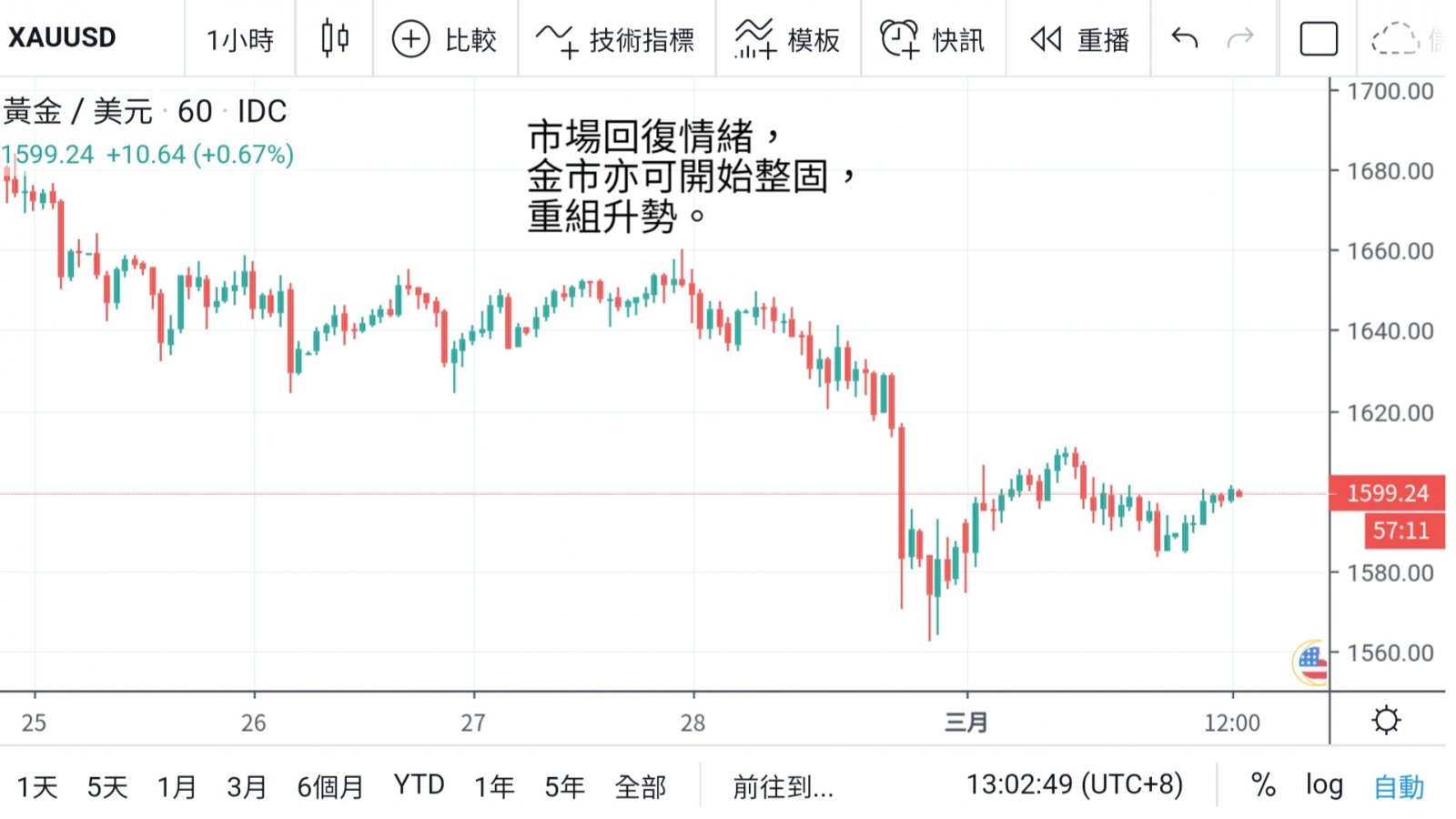 隨著市場情緒緩和,金市上週被拖累回軟的走勢亦會開始平穩,金價波幅開始收窄。金價大體上位於1590至1600之間整固,