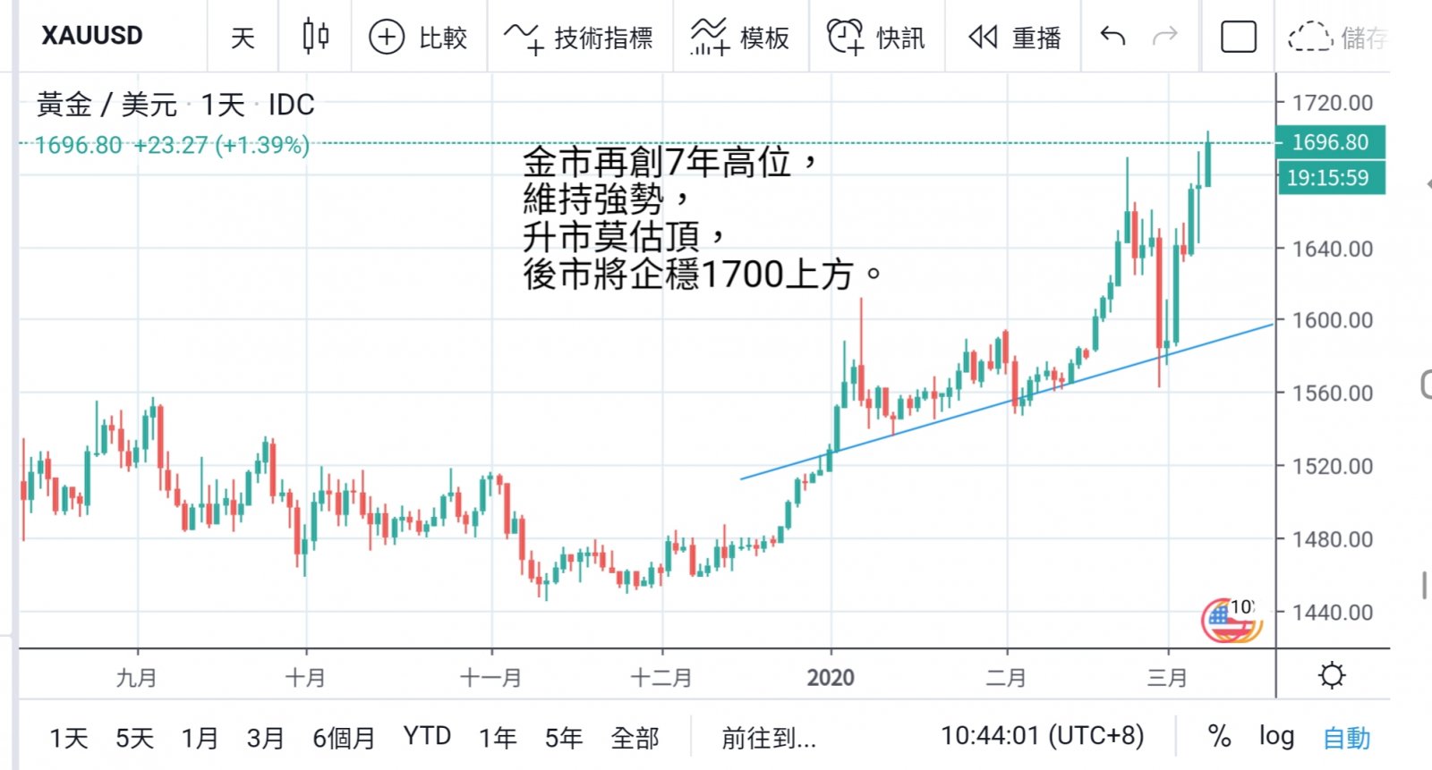 投資者持金成本下降,金價於1700關口爭持後,將再向上挑戰新高,技術上金價只宜順勢買入,升市莫估頂。