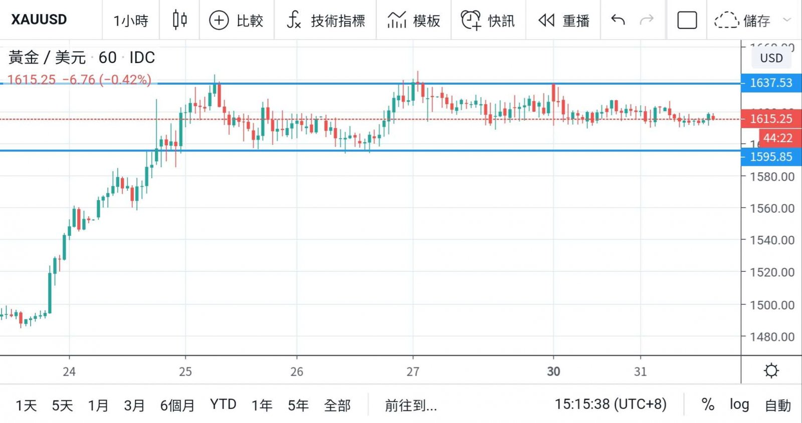 金價昨日一度測試1630關口,未能企穩而再度回落,但跌幅不深,表現較為牛皮,於高位橫行整理。技術上,仍未見金價作出突破,
