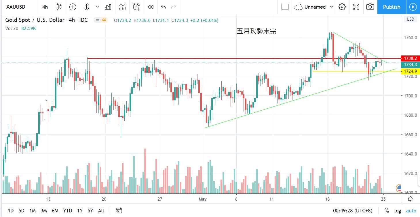 在長期低息環境下,加上中美緊張關係加劇,有利黃金價格走勢。在四小時圖表可見金價走勢仍末跌穿於五月開展的上升趨勢綫,及能守住1725的支持綫。