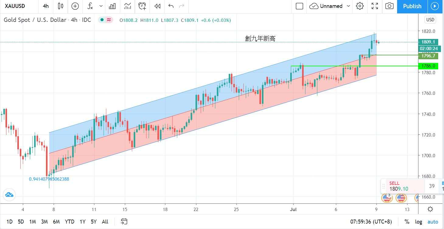 金價再破2011年11月新高,收市報每盎司1808美元。