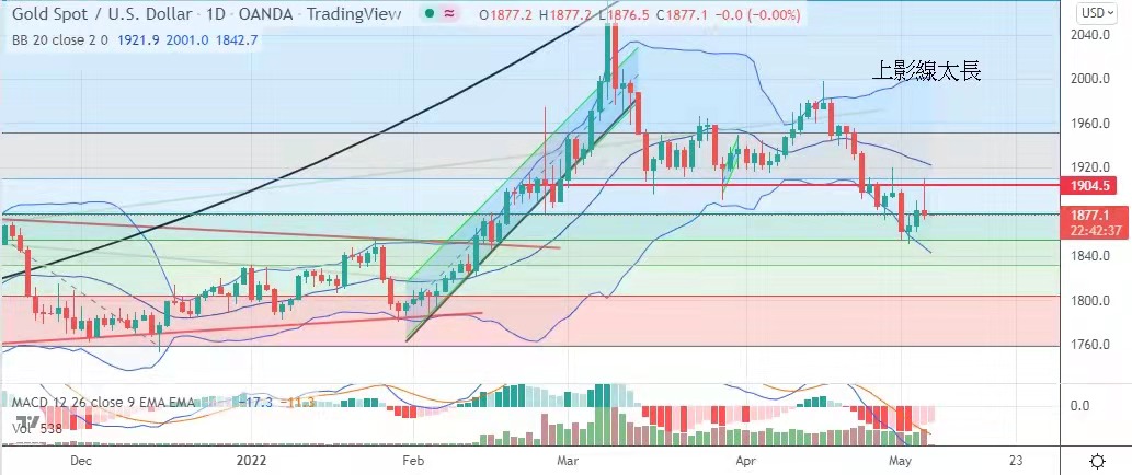 美國十年期國債孳息率升近5年來高位,金價假突破後再次回落,預料短期在1855至1890美元之間爭持,但昨日開出的陰燭上影線太長,