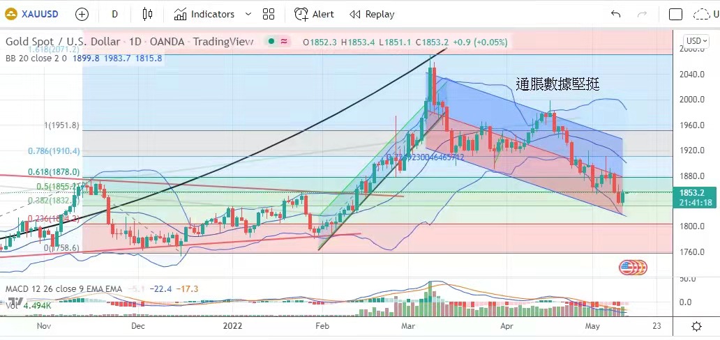 是接近40年以來的歷史高位,通脹數據讓多頭迅速佔優,金價即時抽升14美元,金價曾低見1832.1美元,最高見1858.3美元,最終以 1852.2美元收市,
