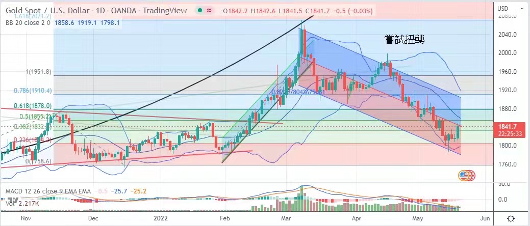 下跌,黃金成避險資金的天堂,金價最低見1810.9美元,最高見1849.2美元,收報1842.2美元,升25.8美元。