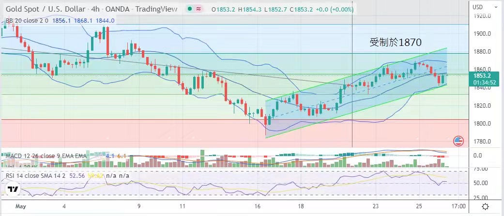 數重上102水平,加上聯儲官員為打擊通脹,大多數官員表態支持在接下來的幾次會議上加息0.5%,加息預期下,增添了金價的壓力,金價最高見1868.1美元,