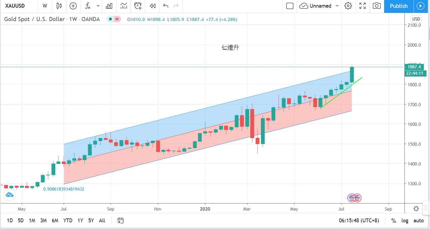 黃金在昨日又再次慣性地破今年新高,曾最高挨近1890美元水平,以每盎司1887美元報收。金價只要今天不跌破1810美元,金價將是連續七星期上升,