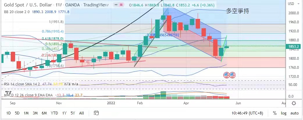金價在上周最低見1840.8美元,最高見1869.8美元,最終以1853.2美元收市,總結一星期,升6.6美元。