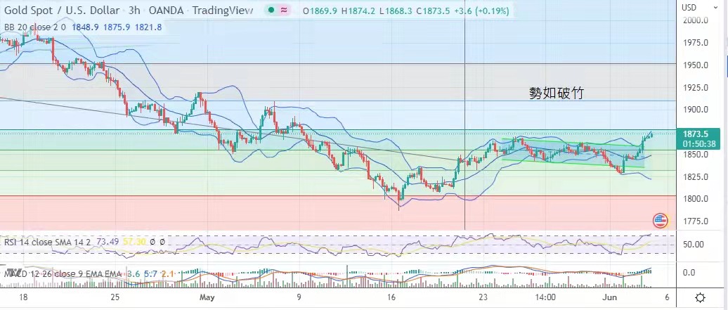 市場關注非農數據, 5月份美國上月非農業就業人數變化,數字出乎意料地低,只新增了12.8萬個就業職位,遠低於市場預期的30萬個,數據令金價一度升穿1870美元,金價強勢畢現,走勢上只要能真正升穿1878美元,最能追近上月高位的1892美元。今日建議波幅1866美元至1880美元。