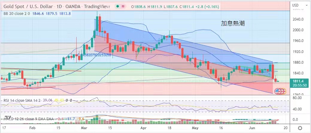 金價曾經反彈,但奈何加息陰霾揮之不去,最終仍是以跌市收場,金價最高見1831.7美元,金價最低見1805.2美元,以1808.5美元收市,跌11美元 。