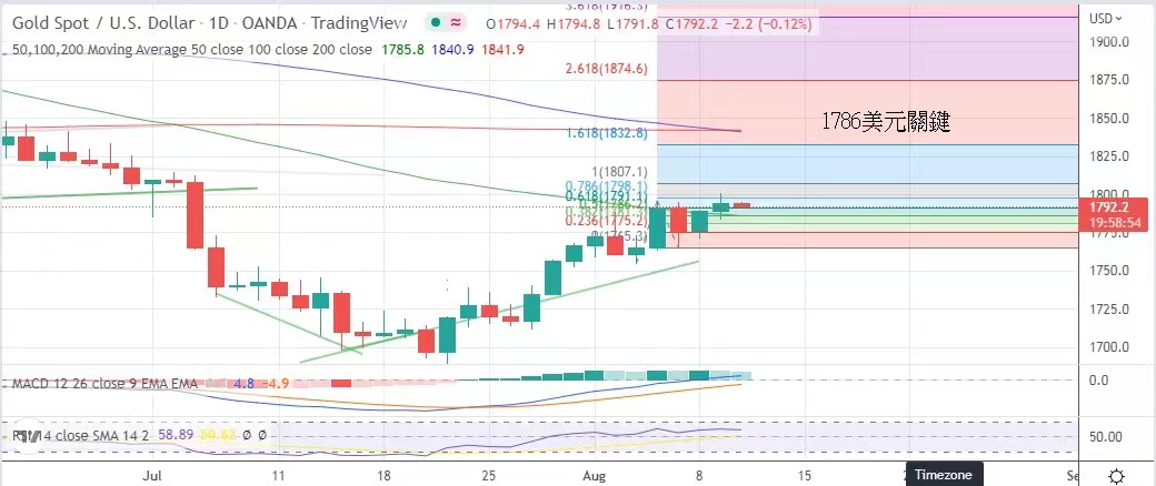 險情緒一度推高金價至1800.5美元,但美國公布第二季勞工成本上升,金價升幅收窄,金價最低見1783.3美元,最終以1794.4美
