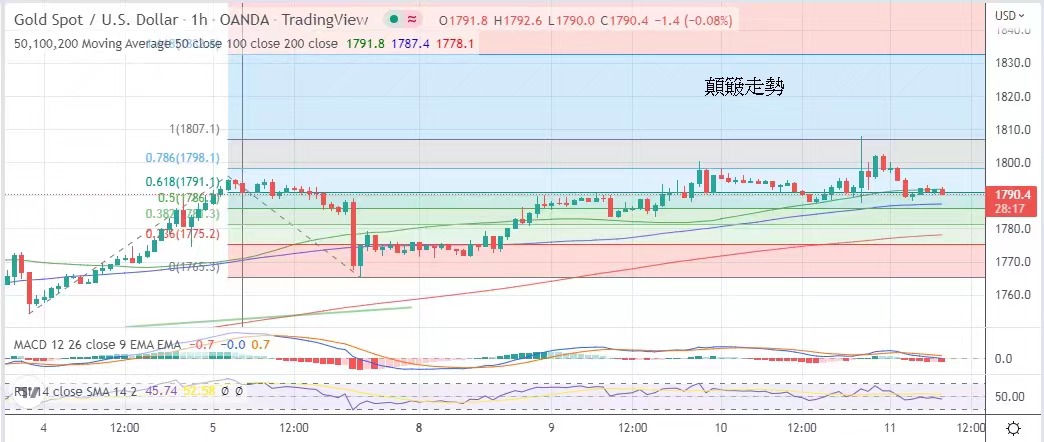 出現顛簸走勢,最高升至1808美元,但最差仍未跌破昨日提及的1786美元關鍵,金價將在1780至1800美元之間整固,預期波幅