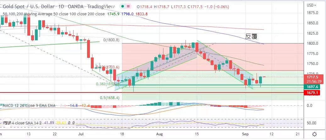 昨日金價得以反彈。近日金市波動,可能市場將繼續反覆,直至聯儲局正式宣布加息為止。今日建議波幅1710美元至