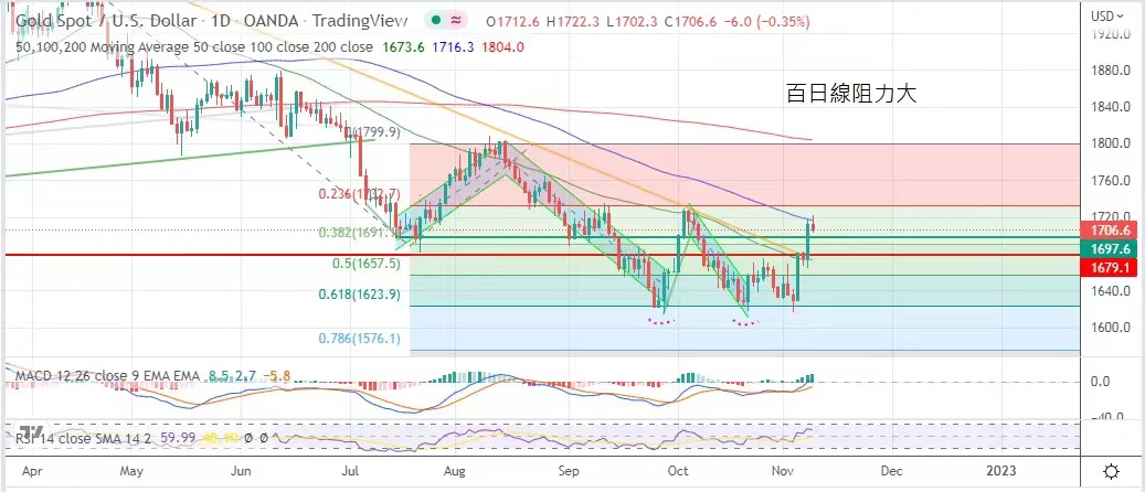 美國中期選舉結果現暗湧,金市走勢亦搖擺不定,美元指數重奪110關口,金價明顯在100天平均線受壓,金價最