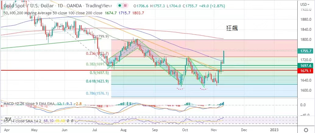 跌穿108關口,金價一度升超過50美元。金價最低見1704美元,通脤數據出爐後,金價最高則升至1757.3美元,