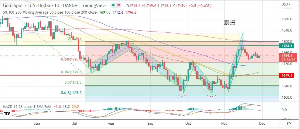 總值、小非農數據,與及美聯儲主席鮑威爾的講話,金價升幅收窄,最後以1749.6美元收市,升7.8美元。