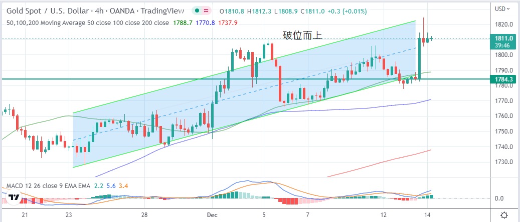 憧憬美聯儲會加放減息步伐,金價即時破位拉升逾20美元,金價最低見1781美元,通賬數據公布後最高曾飆至1824.5
