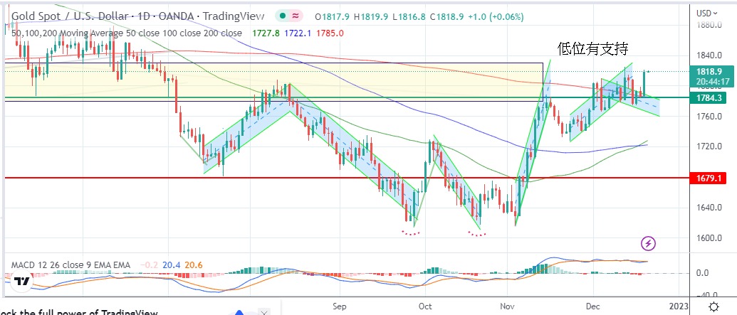 日本央行昨日午後意外地將國債收益率目標上限從0.25%上調至0.5%,是次意外的調整違背多年來日本央行寬鬆政策,此舉引發市場對日本央行退出殖利率曲線控制政策猜測,日本股市急跌2.5%。雖然日本央行行長黑田東彥解釋,此項決定完全不是緊縮,但日圓滙仍大幅走高,拖累美元指數跌至103.7點,再加上昨日美國建築許可低過市場預料逾10%,金價重返1800美元樓上,最高見1821.美元1,最低見1784.7美元,以1817.9美元收市,升30.1美元。