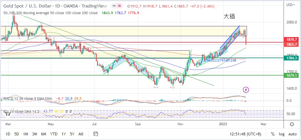 農數據增長三倍高於預期,美元指數在跌破101水平後反底回升至103點,金價墜崖式急跌,金價上周最高見1959.8