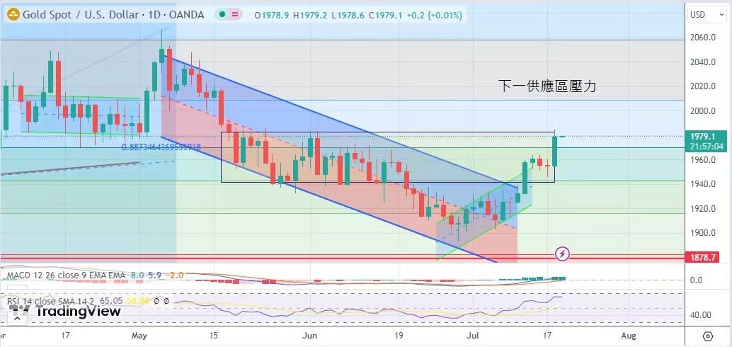 開始發揮力量,憧憬聯儲局將調整7 月加息的幅度,金價大幅攀升,金價正面臨突破下一供應區的阻力,不