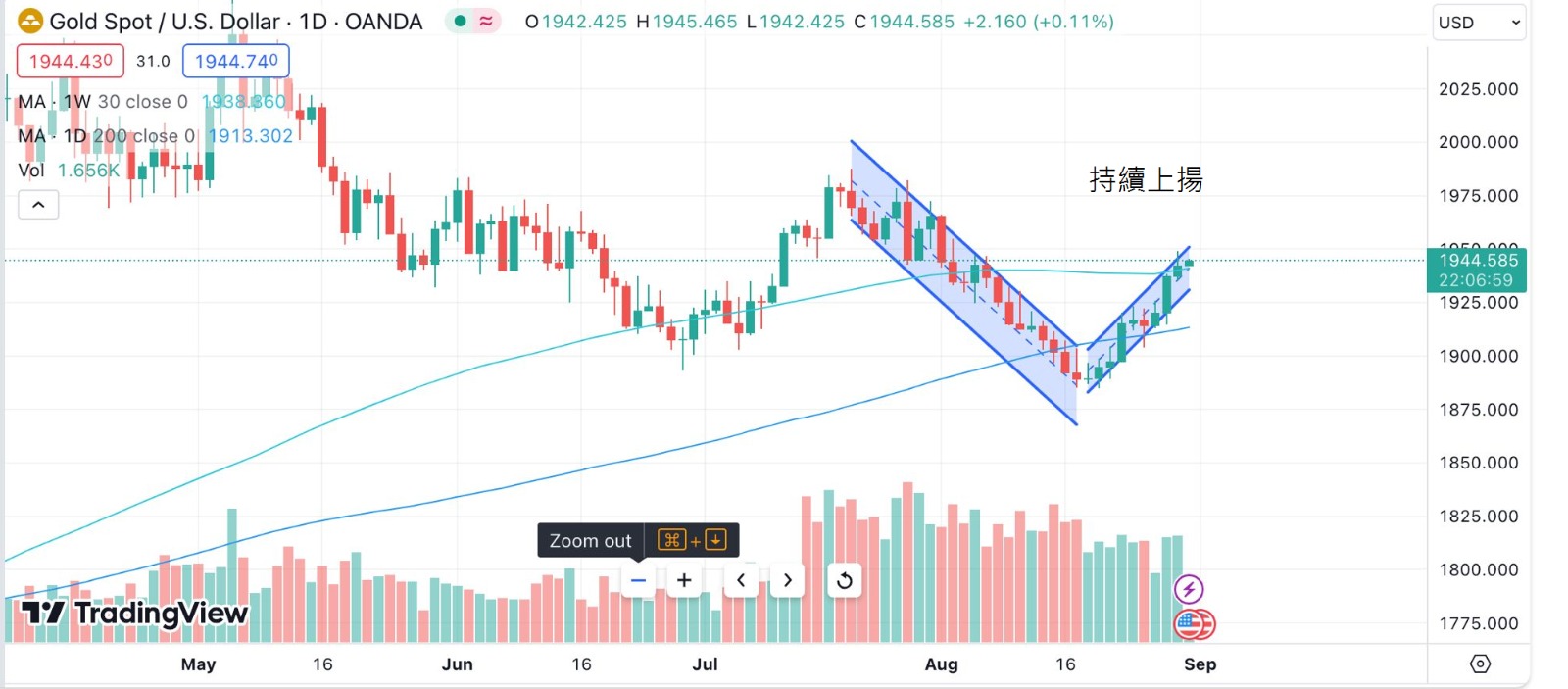 憬有助延後美聯儲加息政策,美元及美國十年期國債輕微回落,金市上行,金價最高見1949美元,最低見