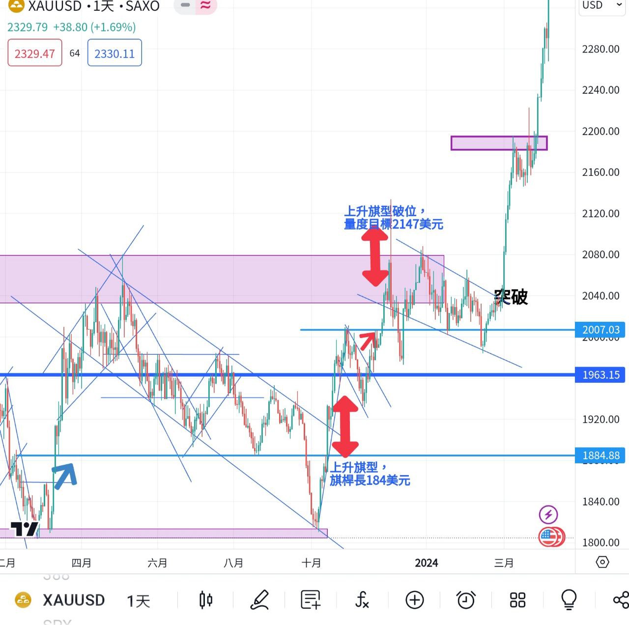 黃金連續6日刷新高,華爾街直呼10000美元。上週金價接連創出高位,復活節假期復市後,承接第一季高收表現,週初又再跳空上漲,這已是金價連續兩週跳空上揚開市,全週升幅近100美元,市場幾乎無懸念預期金價將升抵2300關口,儘管美元走強,市場已無視而追捧黃金。受地緣政治緊張,加上央行積極買入黃金,金價不停突破。市場較為關注的勞工市場表現儘管不俗,ADP及非農均優於預期,但對金價打壓有限,金價回吐一段後便又再創新高,挨近全週高位收市,2024年以來,升近300美元,升勢表現尤如2002年起的大牛市,當年2002起步計,升足十年,累計升幅達7倍。華爾街亦開始有分析師預計今次牛市未達尾聲,頂端預期在10000美元大關,與現時潛在升幅可達4倍。展望本週,美國將公佈CPI,市場正逐漸消化6月未必減息的可能性,或有借口令金價回吐,但黃金市場正受技術面及實質買盤所支撐,仍未有充足訊號顯示金價見頂。市況點睇,不妨互相參考一下。