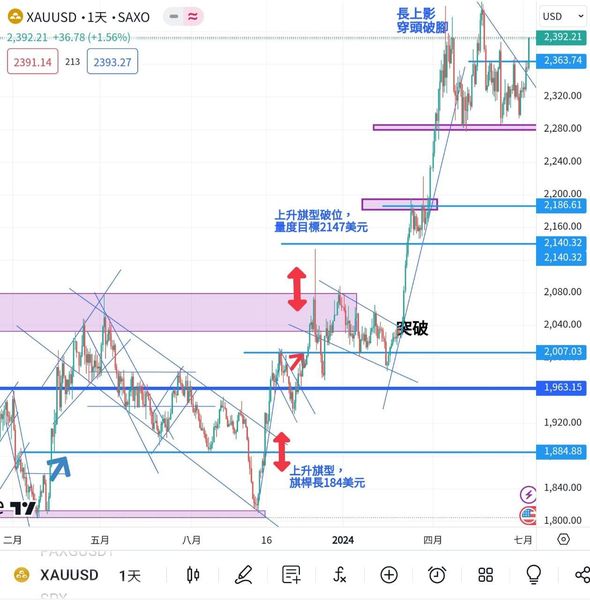 黃金前週守穩2280key level後,買盤陸續浮現,圖表亦突破了一浪低於一浪的下降軌,增強了買家的信心,因此見週末前升勢一發不可收拾,突破並以週內高位收盤。週初時間,美國公佈的PMI普遍轉弱,美元已難複強勢,為黃金鋪好了止跌回升的勢頭。