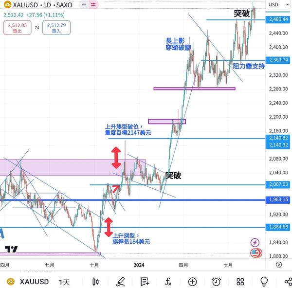 上週黃金主要等待美聯儲放話,冀出現指引推敲美國何時減息及減息幅度。在環球拆倉潮完結後,市場回歸焦點在美國減息期的預算上,週二已有官員派鴿,推動金價再創新高,升至2531.66才開始出現回吐,但和過往走勢一樣,黃金每次回吐均是入市良機,升勢未有扭轉。