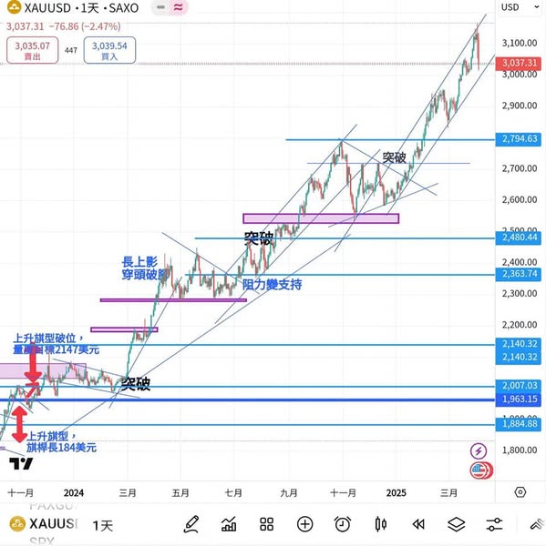 美國總統特朗普稱4月2日將會公佈關稅政策,對全球各國實施關稅,並稱是美國的解放日,貿易戰開戰在即,資金湧入金市避險,直至升至上升軌壓力線才開始放緩。
