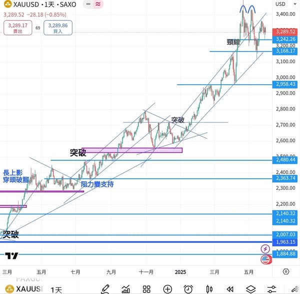 週中時間,美聯儲公佈上次講息會議記錄,多位理事表示出對通脹重臨的擔心,市場解讀美國將更長時間維持高息,金價清晨時份應聲下跌,更甚的是,美國有地區法院裁決特朗普關稅政策越權無效,金價雪上加霜,重挫至3245美元的週內低位。