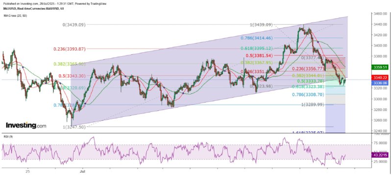 在美國與日本、菲律賓、印尼和越南簽署貿易協議後,市場對於8月1日的高關稅限期前,其他國家與美國達成貿易協議持樂觀態度,其中美歐最終亦達成框架協議,美國對進口歐盟商品徵收15%關稅,而歐盟將會增加對美投資6000億美元,以及向美國採購軍備及總額7500億美元的能源產品。此外,美國與中國今天起將在瑞典舉行新一輪貿易談判,特朗普則一如既往,事先張揚,表示非常接近與中國達成貿易協議。另一方面,市場預期聯儲局將於本周議息會後將維持利率不變,均對金價構成壓力。