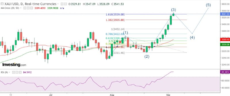 政局愈動盪對金價愈有利,現貨金價在昨天紐約午尾段升至接近3540美元,超出我早前根據突破TD下降軌計算的約3536美元目標。從日線圖觀察,假設7月30日的低位3268.15美元為1浪起步位,2浪由8月8日的3408.83美元展開,並在8月20日的3311.46美元結束後進入3浪。假設3浪升幅相當於1浪的1.618倍這個標準倍數,則金價的3浪將於3539.08美元結束,隨後進入4浪,而最大的調整位將是接近但高於3408.83美元。