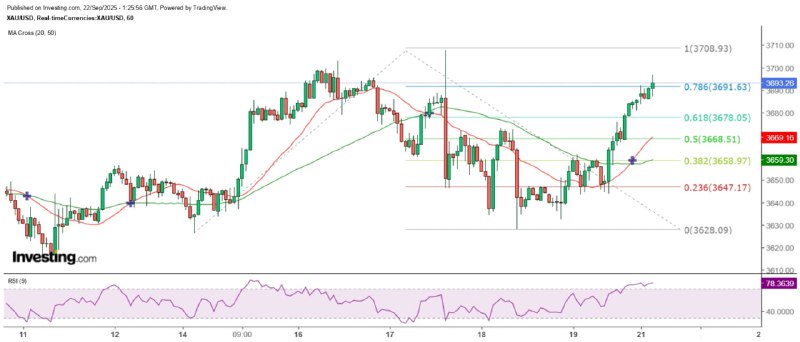 從小時圖所見,金價在9月15日低見3626美元水平後回升,9月18日低見3628美元水平後亦大幅回升,以費波納奇擴展線量度,幅度若達100%,則金價將升至3708.93美元,與3710美元的江恩315度角極之接近,因此可以3710美元為金價具意義的短期阻力位,短期調整則以3678及20小時SMA(現約3668.5)為主要支持。