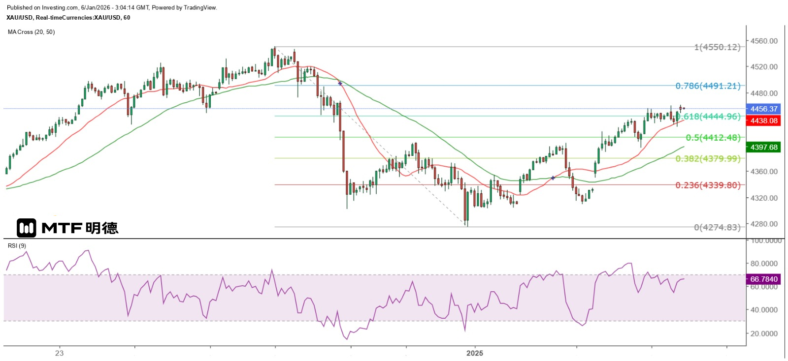 今早現貨金價高見4461.25美元後急跌,跌穿4449美元後反彈,暫時在4450美元以上回穩,在亞洲市早段的低位則為4428.25美元,反映金價暫時在江恩正方形的4410至4460美元範圍上落。從小時圖觀察,目前金價已反彈12月27日以來最大跌幅逾61.8%,而12月29日的大陰燭仍然令我對金價後市不敢太樂觀,金價必須突破並守穩在4550美元以上,才有望再創新高,否則,目前任何的反彈,甚至升近4550美元,好友亦不宜下重注。