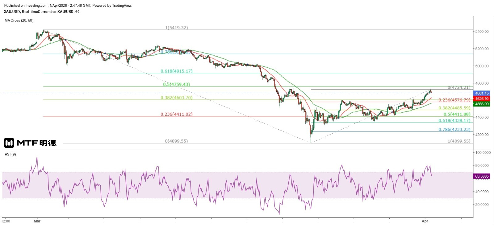 金融市場反應正面,隔晚美股三大指數急漲,納指大升近796點或逾3.8%,標普500升近185點或逾2.9%,道指亦升逾1125點或近2.5%。在油金反向關係持續的情況下,金價上破4600美元心理阻力,現貨金價今早曾高見4724.21美元,直迫3月2日以來最大跌幅之50%反彈位4759.43美元,下一級就是位於江恩45度角的4810美元,換言之,金價已接近短期強阻力。
