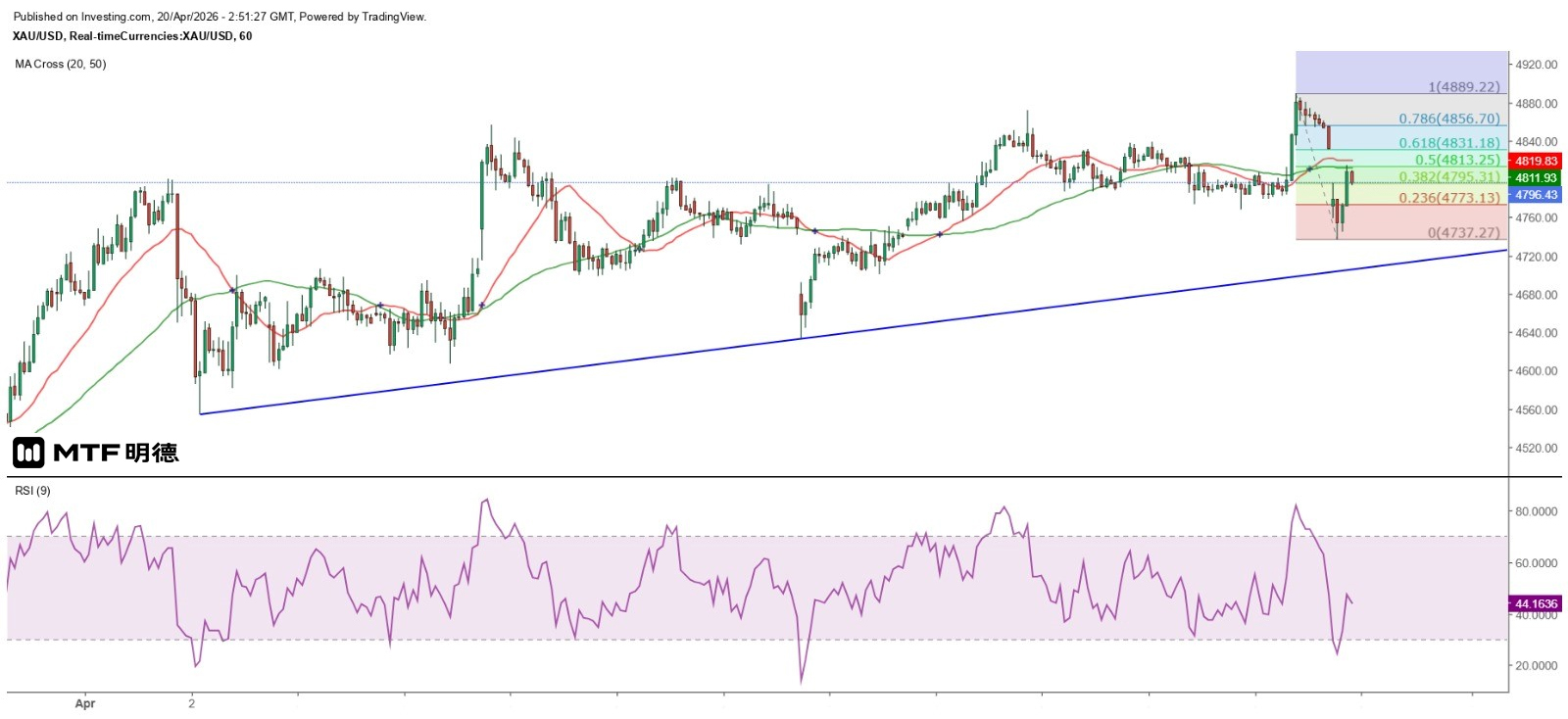 從小時圖觀察,金價勉強維持上升形態,短期支持位約為4710美元,阻力位為下跌裂口頂部4831美元。從日線圖觀察,上周五的反彈高位4889.7美元極接近其時50SMA的4892.45美元,惟始終未能突破,故該線仍是金價的中長線主要阻力所在。從江恩正方形觀察,金價料再次返回4810及4660美元範圍波動,並以向下發展機會較大,期間4760及4710美元可視為支持金價反彈的短期支持位。