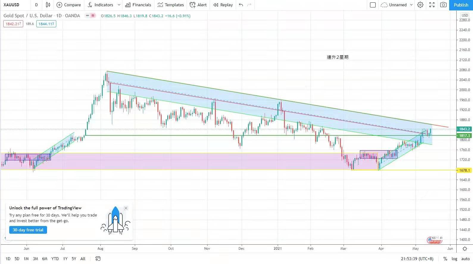 反彈了20美元,但星期三當日最終開出大陰燭,收1816美元,終結5連升及略為破壞走勢。但美國週四公佈上週首度申領失業金人數,數字雖然比預期好,