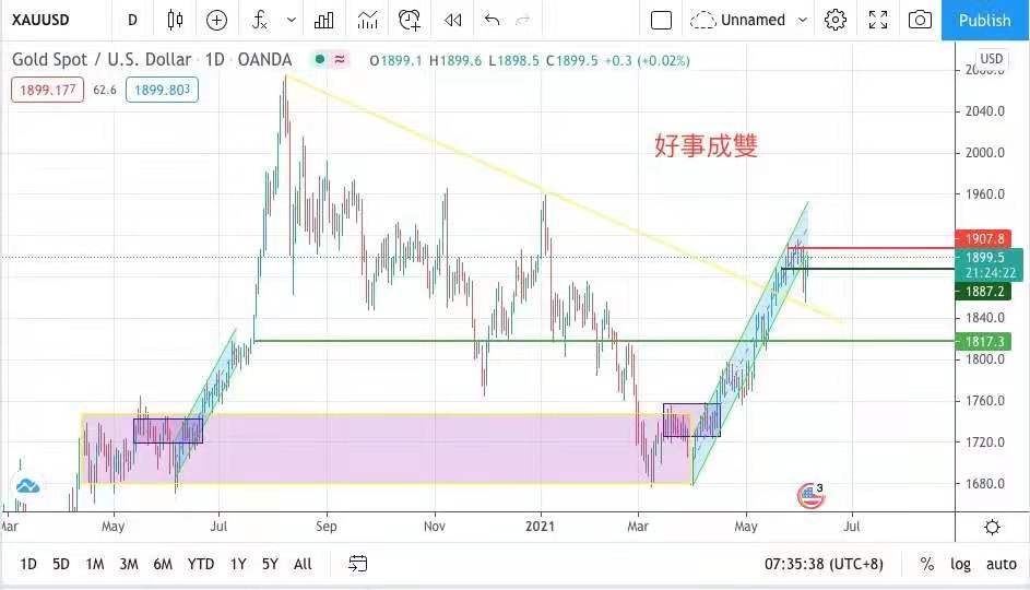 美元因傳俄國去美元化而下跌,金市再獲支持,金價昨日果然挑戰1900美元這個心理關口,並貼近這個位置收市,料仍會在1900美元以上求突破,