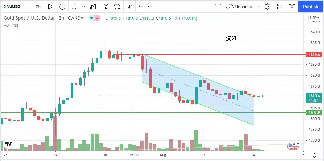 金價昨日下跌,投資者觀望美國本周的非農數據,金市表現沉悶,最高及最低價分別是1807及1815美元,波幅僅8 美元。金價收於1810美元, 跌4美元。