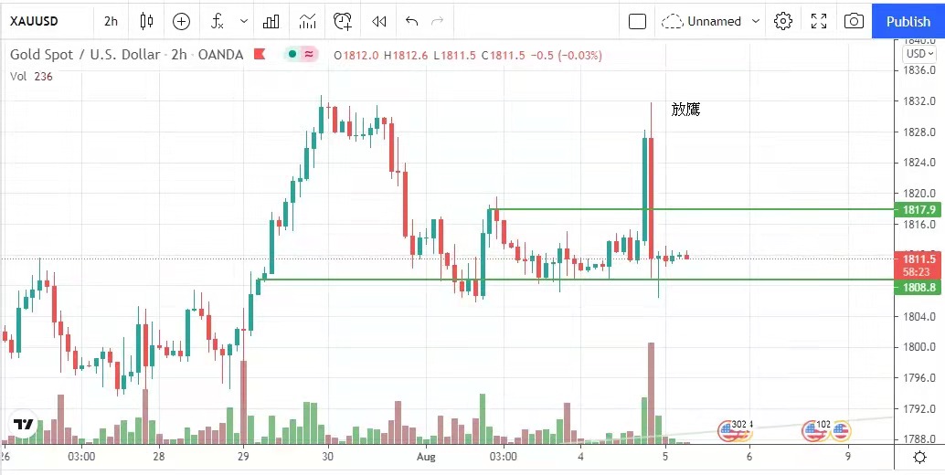 金價昨日反覆,小非農數字增幅創5個月以來新低,市場預計疲弱就業數據支持美聯儲延長收緊貨幣政策,金價急升至1832美元,但美聯儲副主席克拉里達放鷹,表示今年尾可以開始減少買債,及最快在2023年加息,金價急回,最差見1806美元,金價最終收於1812美元, 升2美元。