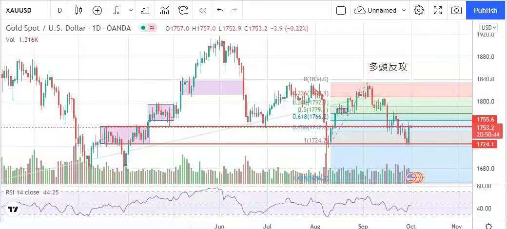 就業數據遜預期成多頭反攻藉口,金市曾急升超過40美元,金價昨日最低見1722美元,金價最高見1764美元,以1757美元收市,升30美元。