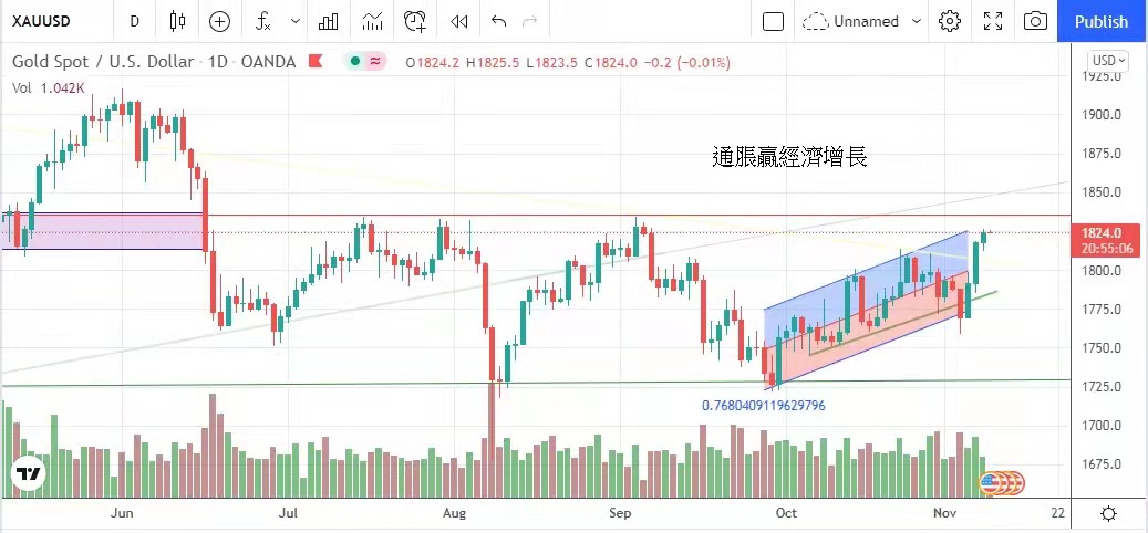 市場押注通脹增長勝過經濟復甦,美元指數跌近94點,加上美聯儲對於加息立場搖擺不定,支持金市上升。金價昨日最低見1812美元,最高見1826美元,