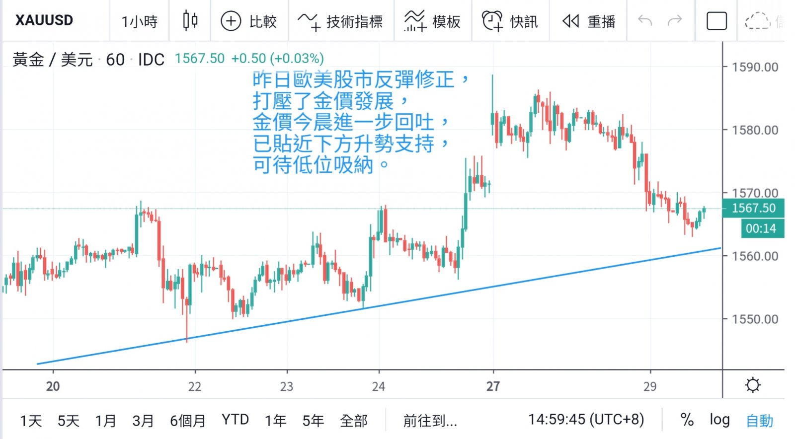 技術上,金價回吐已一步到位,今晨回吐至1563美元,從三週高位回落,跌幅已逾廿美元,